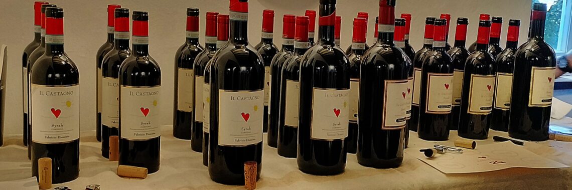 Ho detto paiono perché se c’è una cosa che ho capito nella verticale di dieci annate del suo vino più famoso e importante, il Castagno, è che sembrano vini corposi ma in realtà sono Syrah eleganti. Sembrano essere caldi e ridondanti quando il clima è da annata sahariana (2003-2007-2012-2020-2022), quando anche Fabrizio magari si è lasciato andare al caldo perdendo un po’ del suo simpatico aplomb, ma quando il clima volge al fresco o all’annata più equilibrata (2005-2009-2013-2016-2019) ecco il carattere di Fabrizio marcare l’eleganza e la sobrietà dei suoi Syrah.