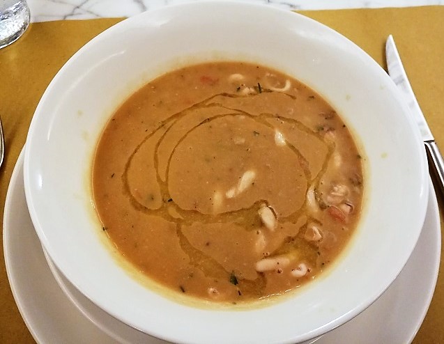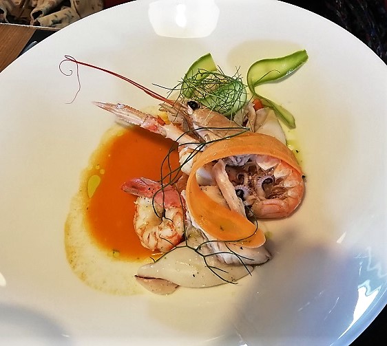 I numerosi ed interessanti piatti in carta ci costringono ad una non facile scelta, optiamo quindi per un Antipasto misto, composto da torta di verdure, torta di riso e cipolla, caponata, polenta incatenata e verza ripiena e per un Gatzpacho e vaporata di mare.