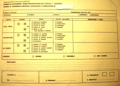 Ma adesso viene il bello: siamo riusciti ad avere la scheda di valutazione utilizzate dalle commissioni di assaggio. Per questo possiamo dire a  quel quasi 40% che ritiene la commissione capace di valutare tipicità e attinenza alle uve del disciplinare che questo, purtroppo, non è possibile! La scheda di valutazione che riportiamo, l’unica e sola autorizzata dal Ministero delle Politiche Agricole non riporta infatti nessuna domanda o dizione relativa alla tipicità  o alla rispondenza o meno al vitigno. In altre parole: nel momento in cui ogni denominazione sbandiera a destra e a manca, nonché ritiene  fondamentale la caratterizzazione data dal vitigno (o dai vitigni) e dal terroir  al proprio vino, questa stessa caratterizzazione non viene presa ufficialmente in considerazione per l’idoneità di quella stessa DOC o DOCG. Uno dei principali cavalli di battaglia del vino italiano di qualità, la tipicità (che per noi è soprattutto rispondenza al vitigno principale della denominazione) non è tra le voci che una commissione ministeriale deve valutare per conferirgli o meno quella stessa patente. Si potrebbe obiettare che i degustatori sanno sempre che denominazione stanno assaggiando e si regolano di conseguenza, ma non crediamo che questo sia abbastanza. Non crediamo che si debba omettere una risposta a quella che è forse la prima domanda che il consumatore si fa ed è sicuramente una forte discriminante nell’acquistare o meno quel prodotto.