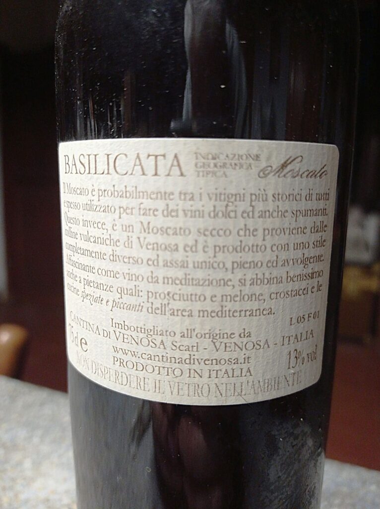 Mi sono subito chiesto se prodotti come questi si facciano ancora e se, allora, si immaginava che essi sarebbero potuti durare fino ad oggi. Poi scopro che in effetti la gloriosa Cantina di Venosa questo Dry Muscat, ossia un Moscato bianco vinificato secco, lo fa tuttora. E che, incredibilmente, le note in retroetichetta sono le medesime, dopo oltre vent’anni. All’epoca, se non ricordo male, ne tiravano centinaia di migliaia di bottiglie ed era un vino inusuale, fatto un po’ per stupire e un po’ per spiazzare. Così almeno mi fu presentato. Lo raccomandavano per smorzare il dolciastro dei crostacei e le spezie della cucina mediterranea, forte – e qui copio spudoratamente da un’antica recensione del compare Luciano Pignataro recuperata in rete – di un invidiabile rapporto qualità/prezzo.