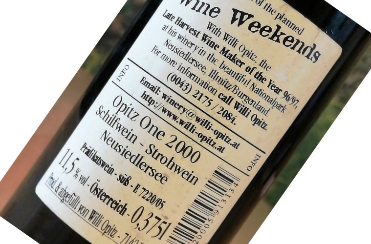 Opitz One 2000 Schilfwein, Willi Opitz: letteralmente vuol dire “vino di canna”, perchè l’uva di Zweigelt viene fatta appassire sulla canna palustre. Dolcissimo, potrebbe essere un Trockenbeerenauslese e ricorda certi Porto.