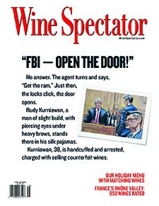 La copertina è interamente dedicata al caso Kurniawan, il noto contraffattore di vini pregiati. E di fatti, dopo l’editoriale di Shanken e Matthews, dedicato ovviamente alla lotta alla contraffazione, le rubriche di attualità (gli incendi in California), le pagine degli opinionisti (Laube sui Cabernet di Sonoma, Kramer sulla tipicità, Sanderson sul ritorno del tappo di sughero).