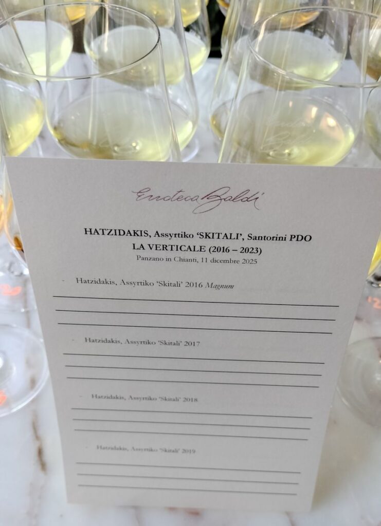 I ¾ del genio li abbiamo così messi in tavola (in tutti i sensi) ma “purtroppo” manca e mancherà sempre la velocità di esecuzione perché la verticale dal 2016 al 2023, dell’Assyrtiko Skytali, etichetta principe di Hatzidakis, che abbiamo fatto all’Enoteca Baldi a Panzano è stata tra le più lente e goduriose degli ultimi anni.