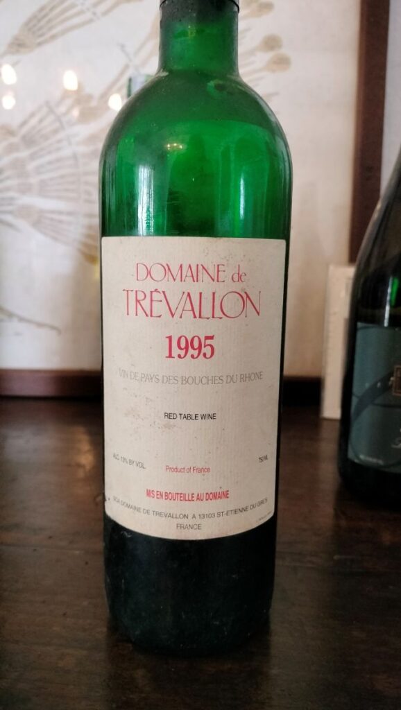 L’azienda nasce nel 1973 e usa sin dall’inizio un uvaggio strano per la zona, 50% Cabernet Sauvignon e 50% Syrah. In vigna lavorano seguendo i dettami della viticoltura biologica. Il nostro del 1995, che allora era un vin de pays ma oggi è divenuto IGP, non sfugge all’uvaggio classico equamente diviso tra cabernet sauvignon e syrah (solo dal 2020 hanno piantato anche del cinsault) nasce da una vendemmia difficile con un mese di settembre dall’azienda definito “disastroso”.