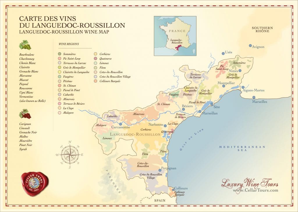 La Clape è una piccola AOC (nemmeno 800 ettari) nel Languedoc-Roussillon, per precisione tra la città di Narbonne e il mare. E’ una specie di piccolo massiccio (è anche un parco naturale) roccioso che si innalza dalla pianura e arriva fino sulla costa con scogliere a picco. Le strette valli sono marnose, il clima è dichiaratamente caldo-mediterraneo ma i venti (spesso molto forti) portano sia temperature più miti che problemi: i vitigni sono i classici del Languedoc con una prevalenza della Grenache.