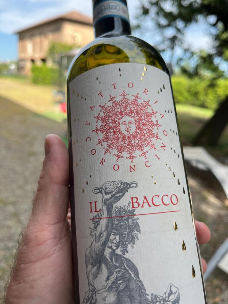 V.C. “E’ fatto prevalentemente con le pressature del Gaiospino e del Coroncino, le nostre due selezioni che nascono una in terreno argilloso e l’altra in terreno calcareo. Quindi il Bacco ha in sé entrambi i terreni. Ma a queste, che sono molto ricche e danno soddisfazione in bocca, manca un po’ di acidità e non hanno alcuni dei profumi “alti” del mosto fiore. Questo perché noi aggiungiamo ossigeno alle pressature quando sono mosto, in modo da togliere tante di quelle sostanze facilmente ossidabili di cui le seconde pressature sono ricche ma che ci creerebbero problemi divenendo vino. Facendo questo togliamo anche una parte dei profumi e li reintrego aggiungendo altro vino, che nel caso del 2023 era la vasca più buona del Coroncino. Parlo di profumi ma questi per me non sono poi fondamentali, l’importante è che il vino sia armonico e completo in bocca e di solito il Bacco, senza l’aggiunta di una parte del Coroncino è cadente, gli manca un po’ di freschezza aromatica.”